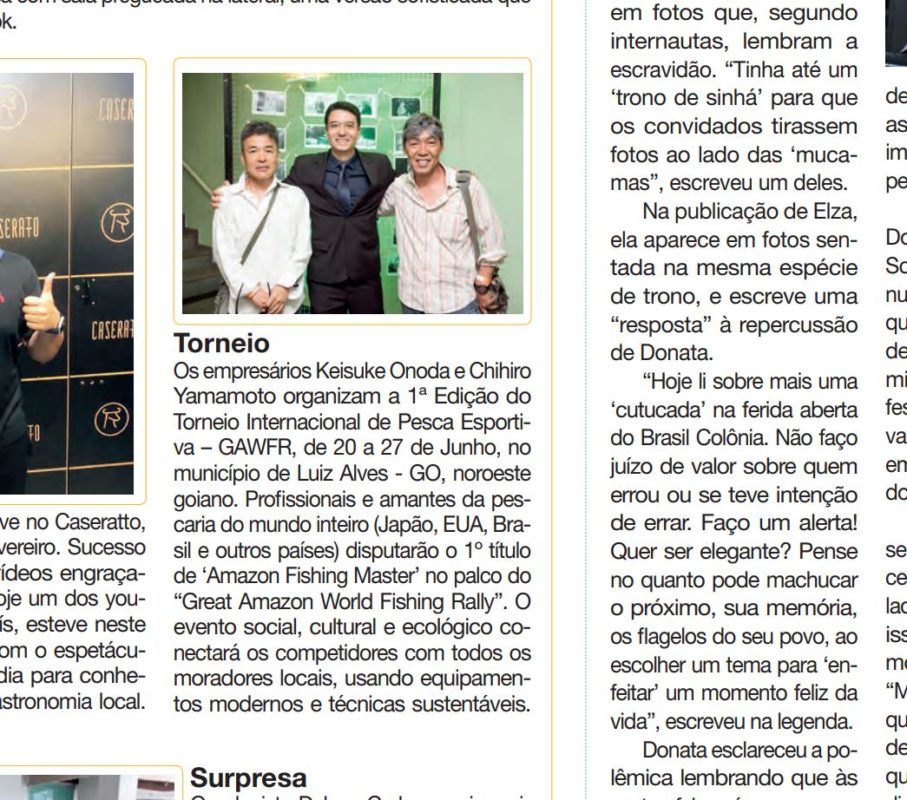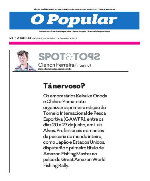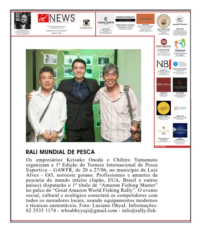 Os empresários Keisuke Onoda e Chihiro Yamamoto organizam a 1ª Edição do Torneio Internacional de Pesca Esportiva – GAWFR, de 20 a 27 de Junho, no município de Luiz Alves – GO, noroeste goiano. Profissionais e amantes da pescaria do mundo inteiro (Japão, EUA, Brasil e outros países) disputarão o 1º título de ‘Amazon Fishing Master’ no palco do “Great Amazon World Fishing Rally”. O evento social, cultural e ecológico conectará os competidores com todos os moradores locais, usando equipamentos modernos e técnicas sustentáveis.