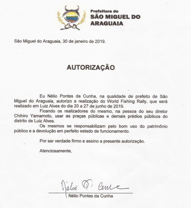 The World Fishing Rally will be held with the official support of the City of Sao Miguel do Araguaia.
